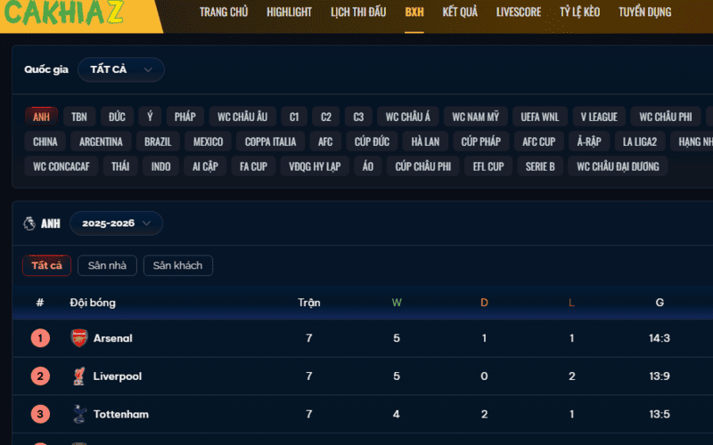 Cakhia cập nhật bảng xếp hạng Ngoại Hạng Anh nhanh chóng và chi tiết